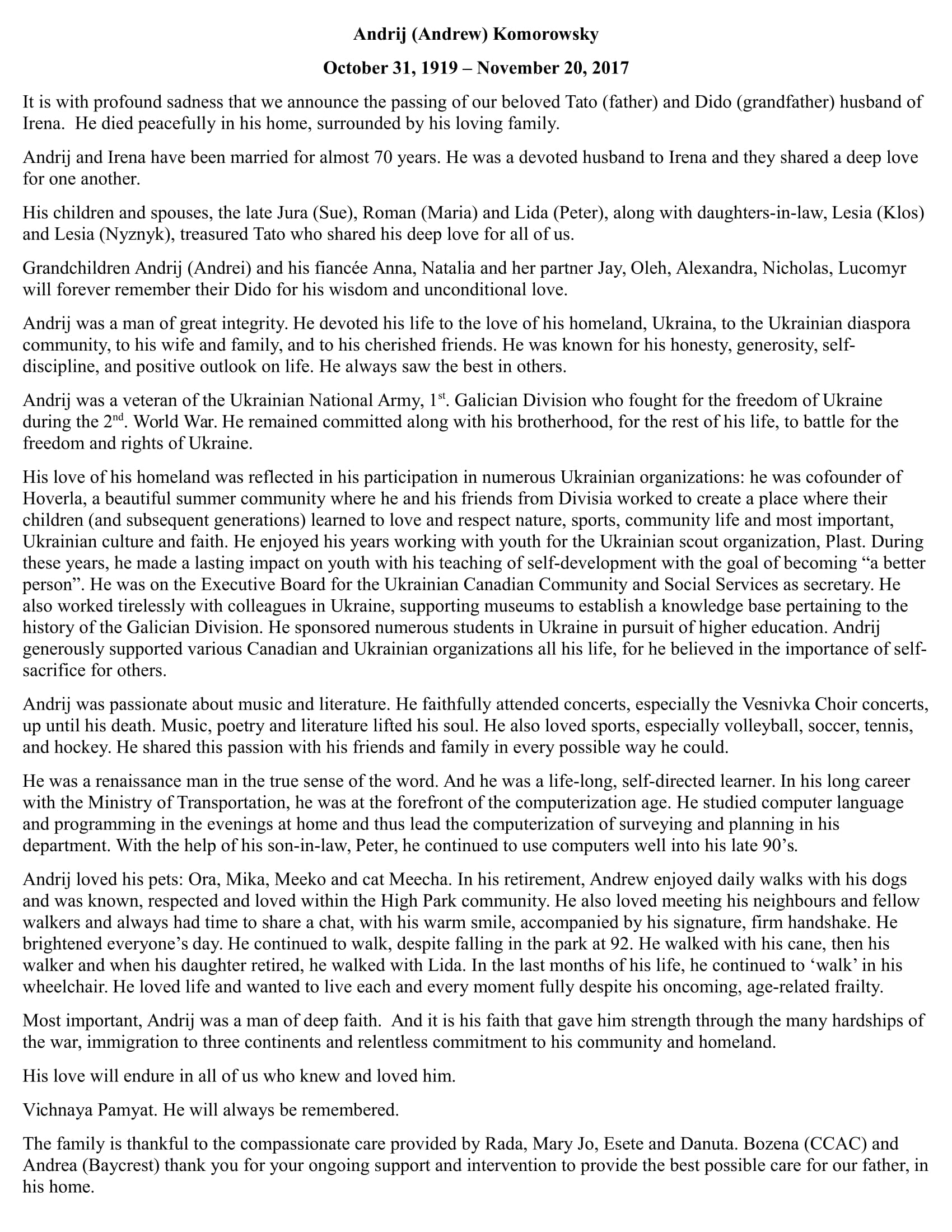 I'm sad to hear that Pan Andriy died last week. My father Andriy Chorny was best friends with Pan Andriy both at Hoverla and in Toronto/West Arka! Vichnaya Pamyat!
